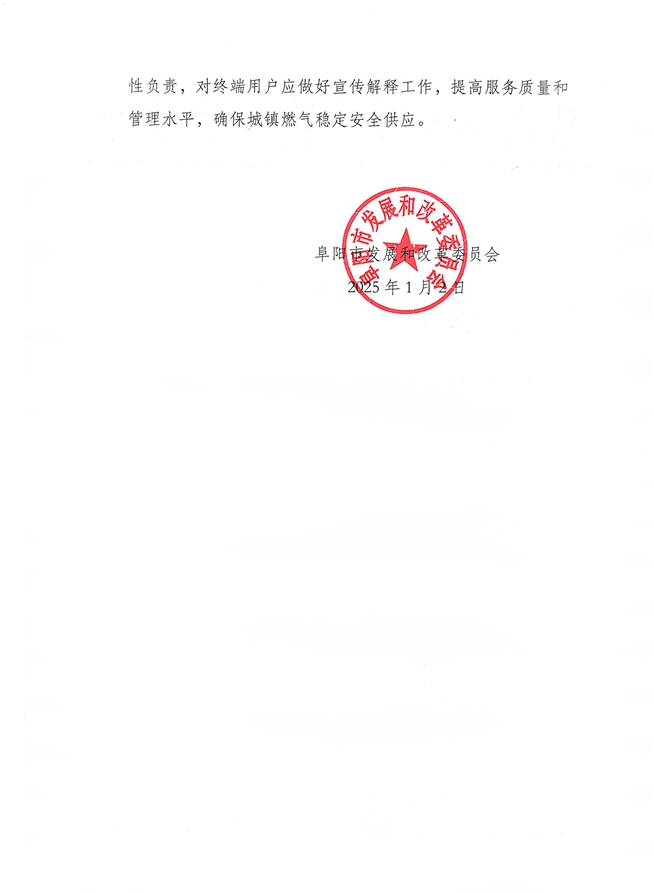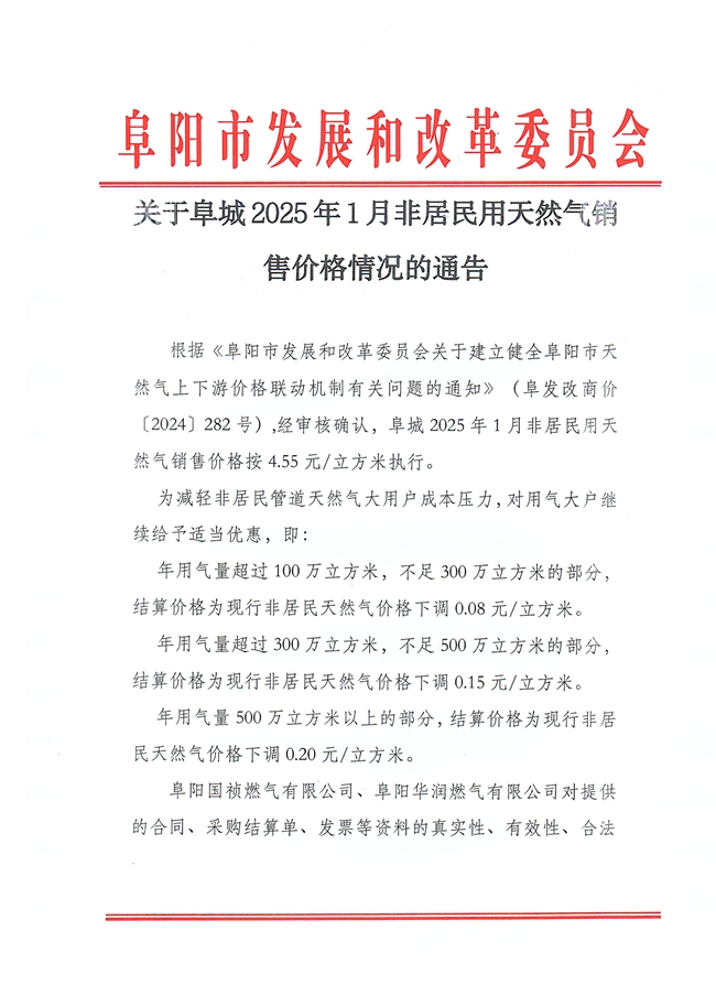 关于阜城2025年2月非居民用天然气销售价格的通告