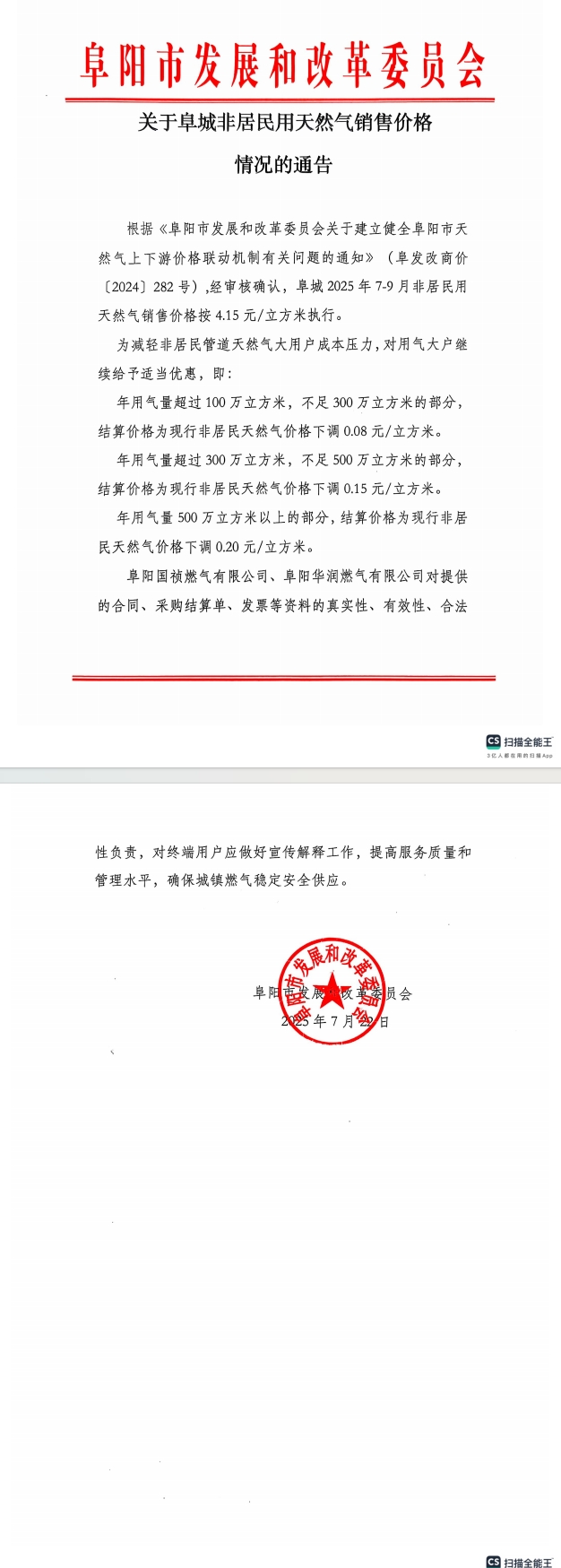 根据《阜阳市发展和改革委员会关于建立健全阜阳市天然气上下游价格联动机制有关问题的通知》(阜发改商价〔2024〕282号),经审核确认,阜城2025年7-9月非居民用天然气销售价格按4.15元/立方米执行。