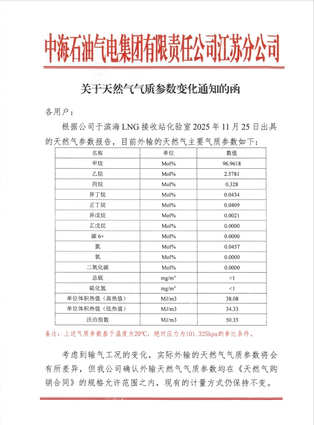 现将 [2025年11月] 的天然气气质分析报告予以发布(详见附件)。本期检测结果显示,所供应天然气的各项组分指标(包括但不限于甲烷含量、高位发热量、总硫含量、硫化氢含量等)均符合《天然气》(GB 17820-2018)等国家质量标准的要求,气质优良,可供安全放心使用。