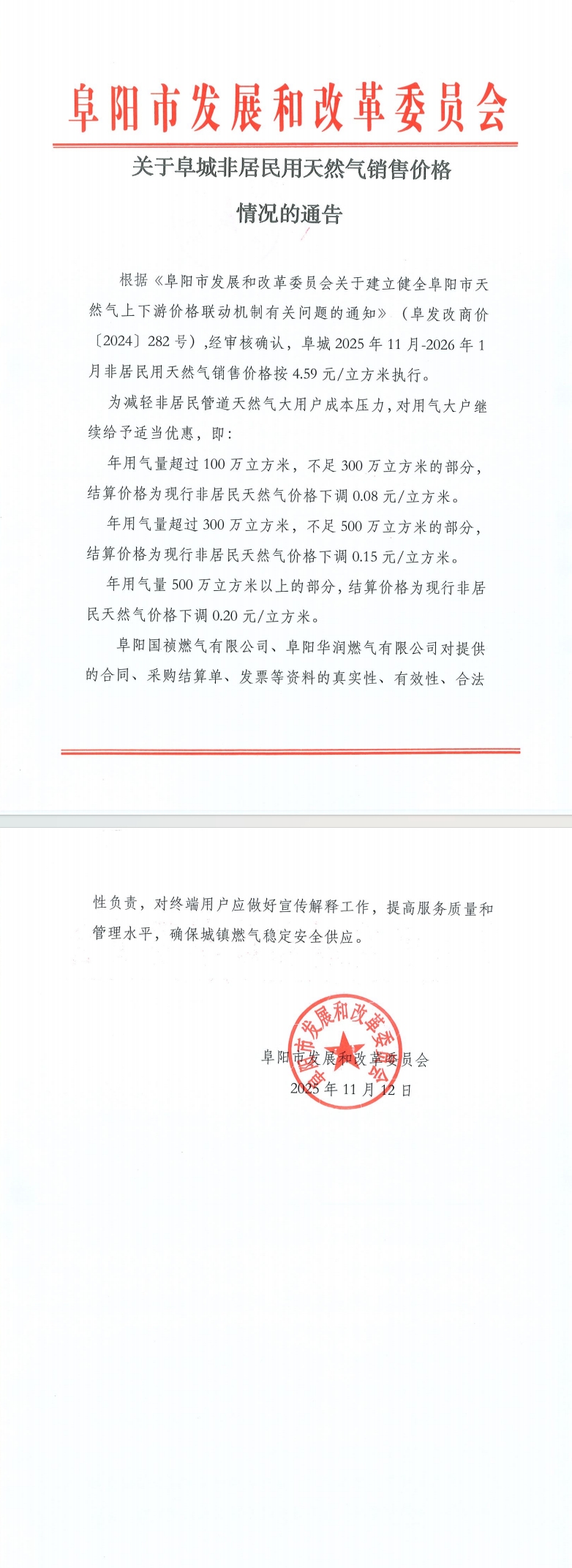 根据《阜阳市发展和改革委员会关于建立健全阜阳市天然气上下游价格联动机制有关问题的通知》(阜发改商价〔2024】282号),经审核确认,阜城2025年11月-2026年1月非居民用天然气销售价格按4.59元/立方米执行。